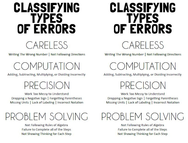 DeleteI agree with Stacey about recopying their error. What happens if they make the same error multiple times? YIKES! I love your "Types of Errors" and have been having students classify their errors on test corrections for years. Honestly, it is the only way I could get them to even look at what they were getting wrong. I'll send you some of my revisions over the years. Maybe it's just me, but sometimes my kids would just write "I had no idea how to do this problem!" as their reason. Do you have that ever? Thanks again!